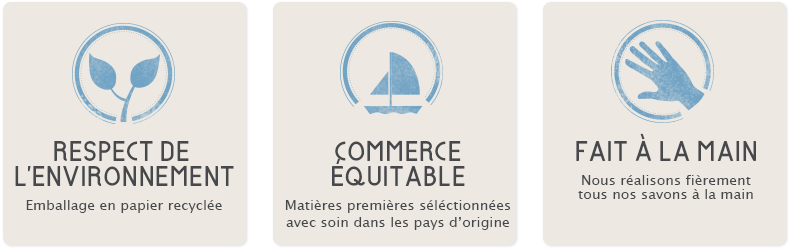 Carnets de savon est une entreprise artisanale à taille humaine, dont les préoccupations se portent sur la santé et le bien-être. Nous sommes dans une logique de conseil et de proximité. - Nos produits sont certifiés 100% naturels, exempts de tous parabens, agents de texture, parfums de synthèse, alcool, conservateurs. Ils ne sont pas testés sur les animaux. Nous n'utilisons que des huiles essentielles non allergènes. - Les matières premières sont issues du commerce équitable et/ou de l'agriculture biologique, dans le respect des producteurs et des filières écologiques d'approvisionnement. - Nous nous engageons à vous fournir des produits de qualité en accord avec les recommandations européennes ISO 22716 sur la fabrication des cosmétiques